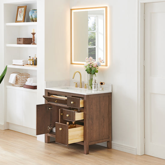 The Cerrito 36" vanity maximizes storage within a smaller footprint. A flip-down drawer, soft-closing drawers, and concealed cabinet space keep essentials organized while maintaining a clean, uncluttered countertop. -