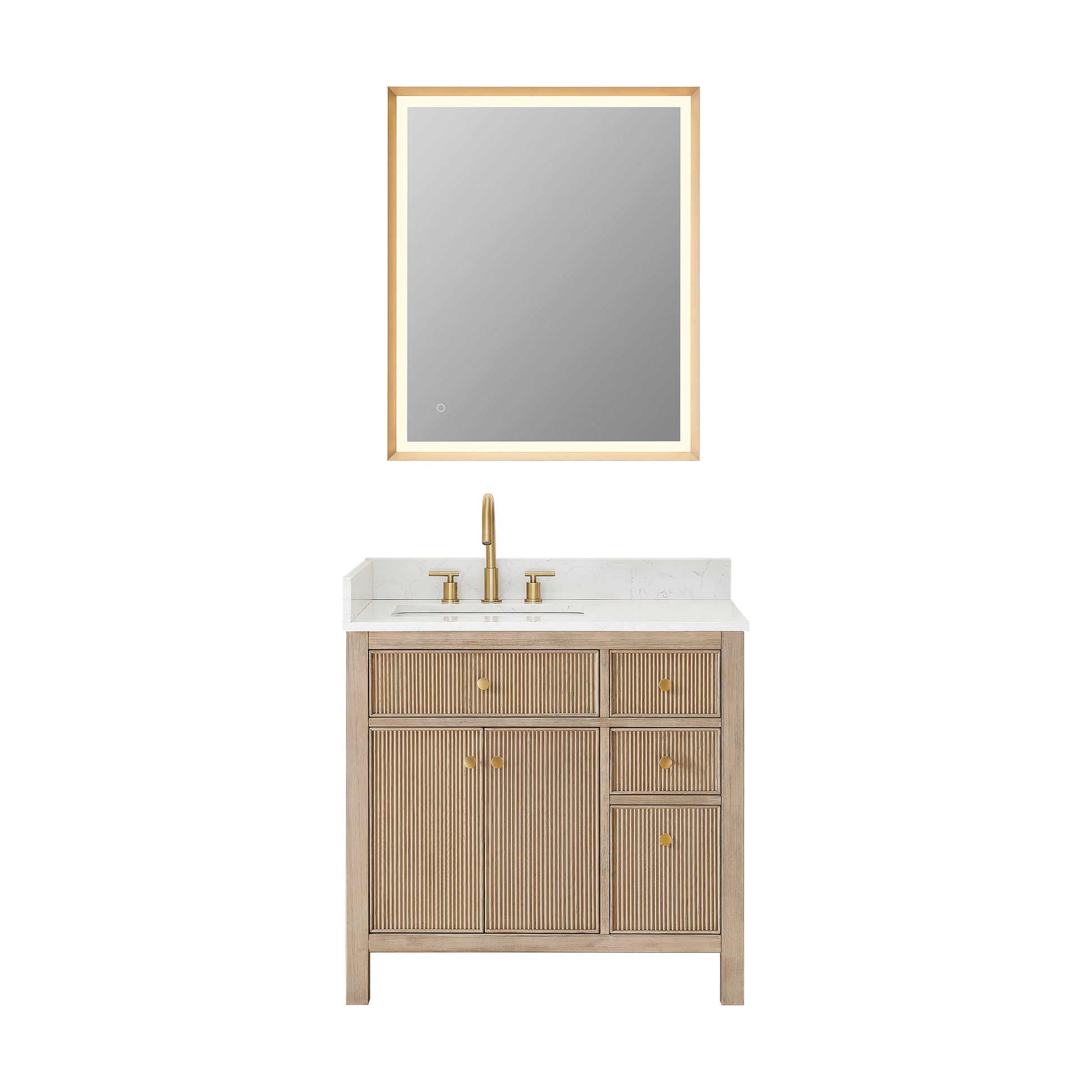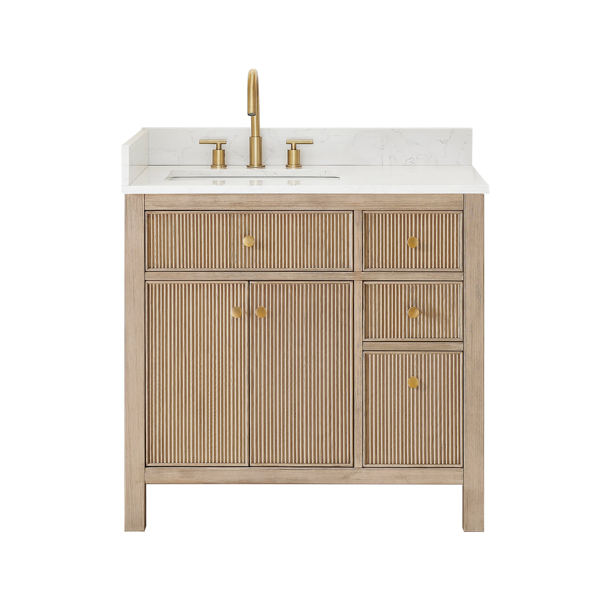 Designed for smaller bathrooms that still demand refined design, the Cerrito 36" Single Sink Vanity brings contemporary elegance into a compact footprint. Sculpted fluted doors highlight the natural beauty of real wood, while a crisp Grain White stone countertop adds a clean, modern contrast.