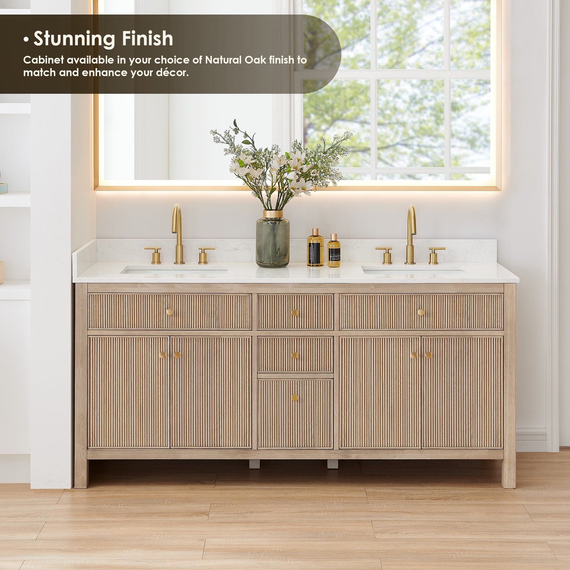Fluted cabinet doors and warm wood finishes bring depth and character to a modern design. Available in Natural Oak or Brown Brushed Oak, the Cerrito is topped with a Grain White engineered stone surface and accented with brushed gold hardware for a polished, designer finish.