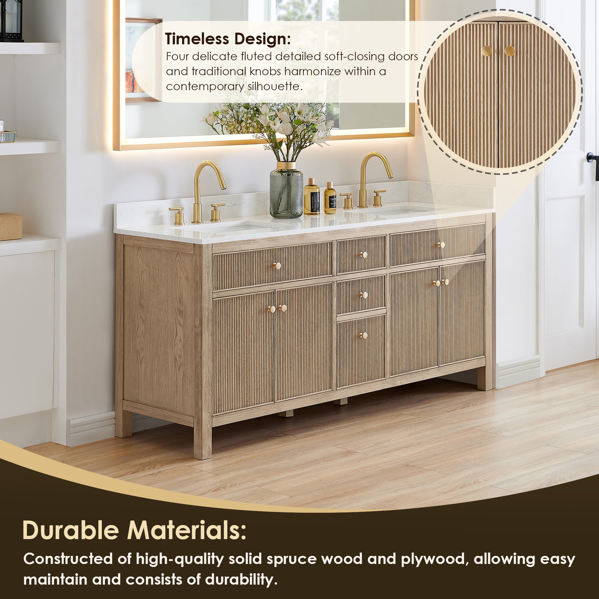 Crafted from solid spruce wood and reinforced plywood, the Cerrito 72" vanity is built for durability and long-term use. Sculpted fluted doors add texture and depth, elevating the vanity’s contemporary silhouette without sacrificing warmth.