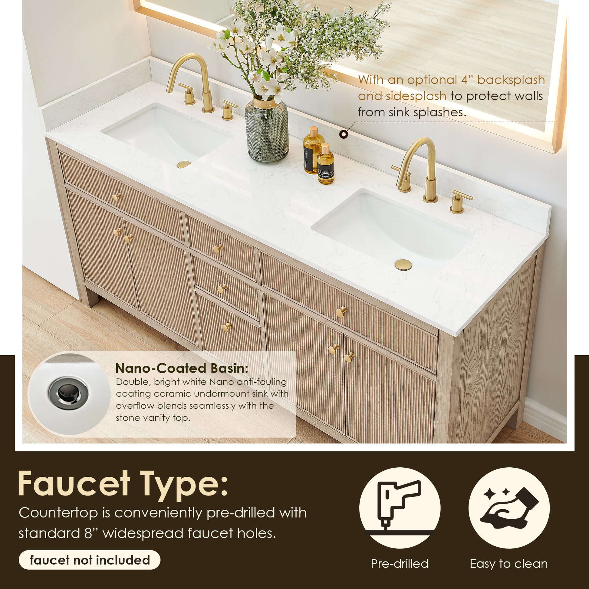 The countertop is pre-drilled for standard 8" widespread faucets for easy installation and flexibility.
