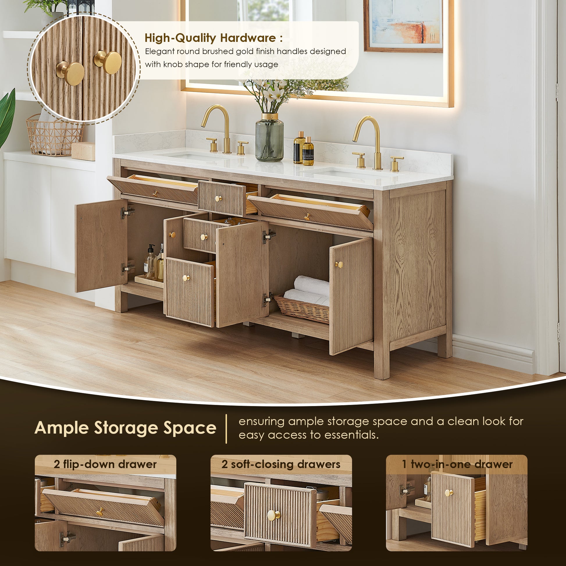 - High-Quality Hardware: Elegant, round Brushed Gold-finish handles feature an ergonomic knob for comfort and ease of use