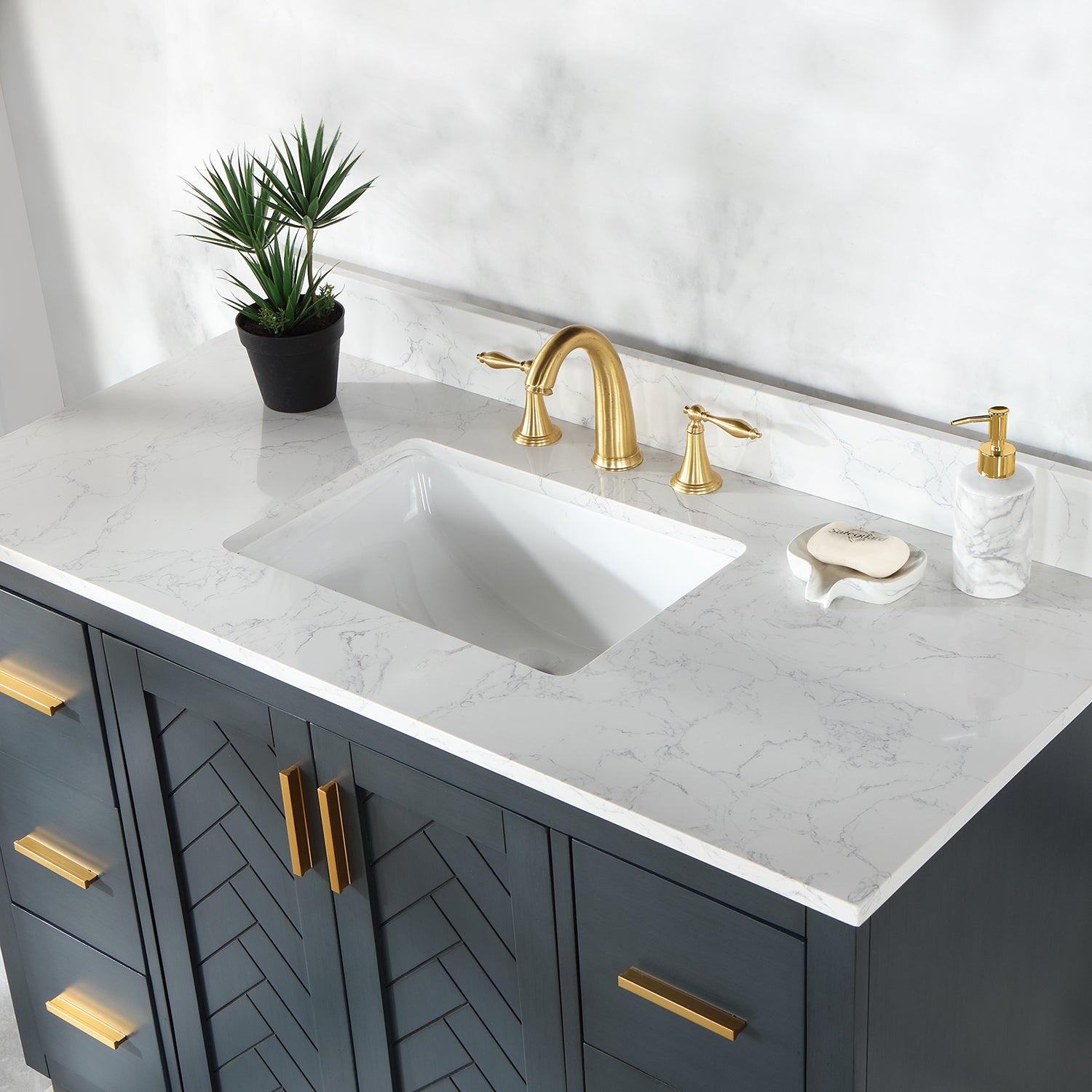 Designed for contemporary bathrooms that favor bold style and smart functionality, the Gazsi 48" Single Sink Vanity makes a confident design statement without sacrificing practicality. Textured chevron-patterned doors, a recessed plinth base, and a rich cabinet finish give the Gazsi a modern, architectural presence.